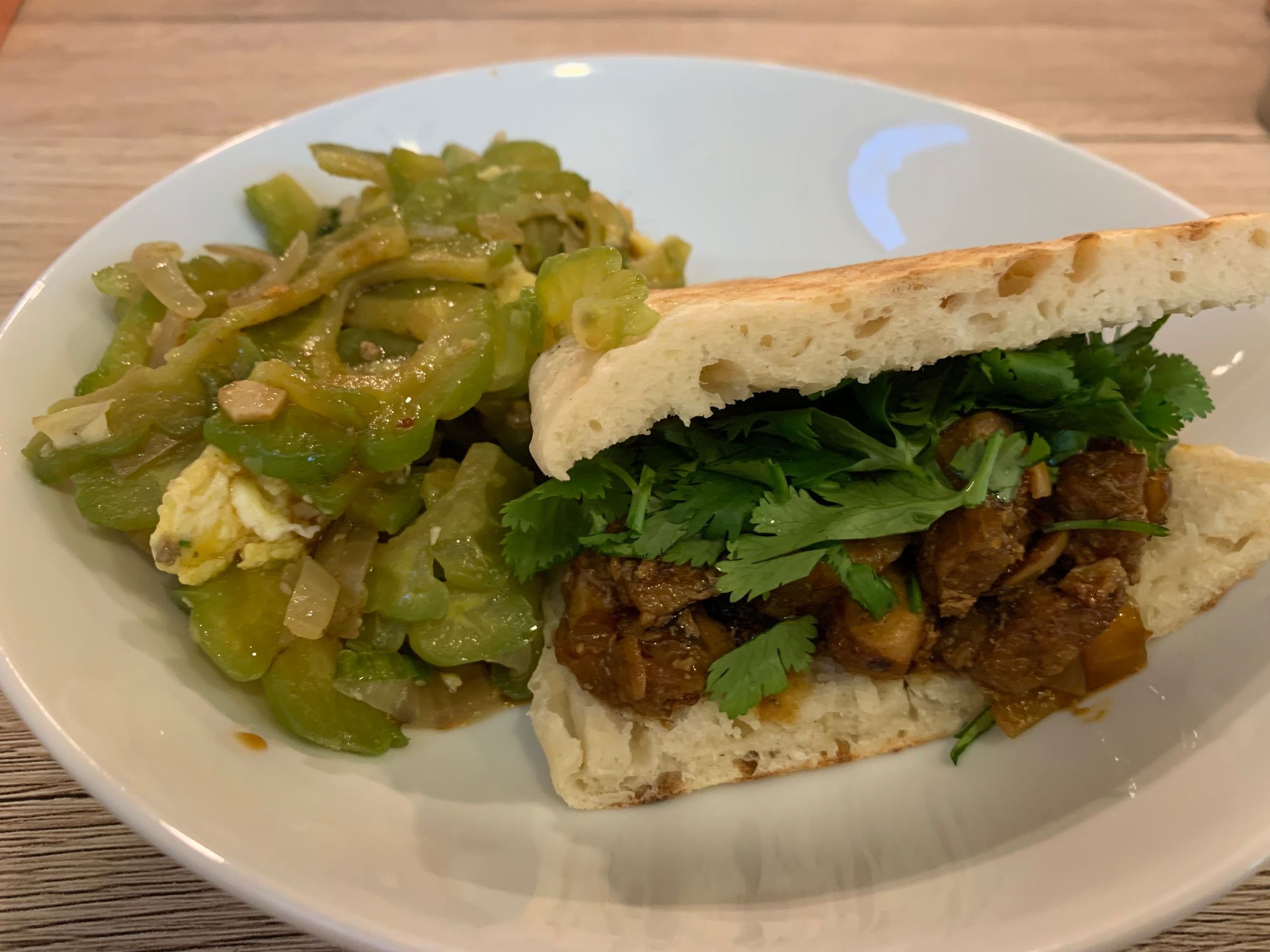 Homemade rou jia mo (肉夹馍) and bitter melon with egg.