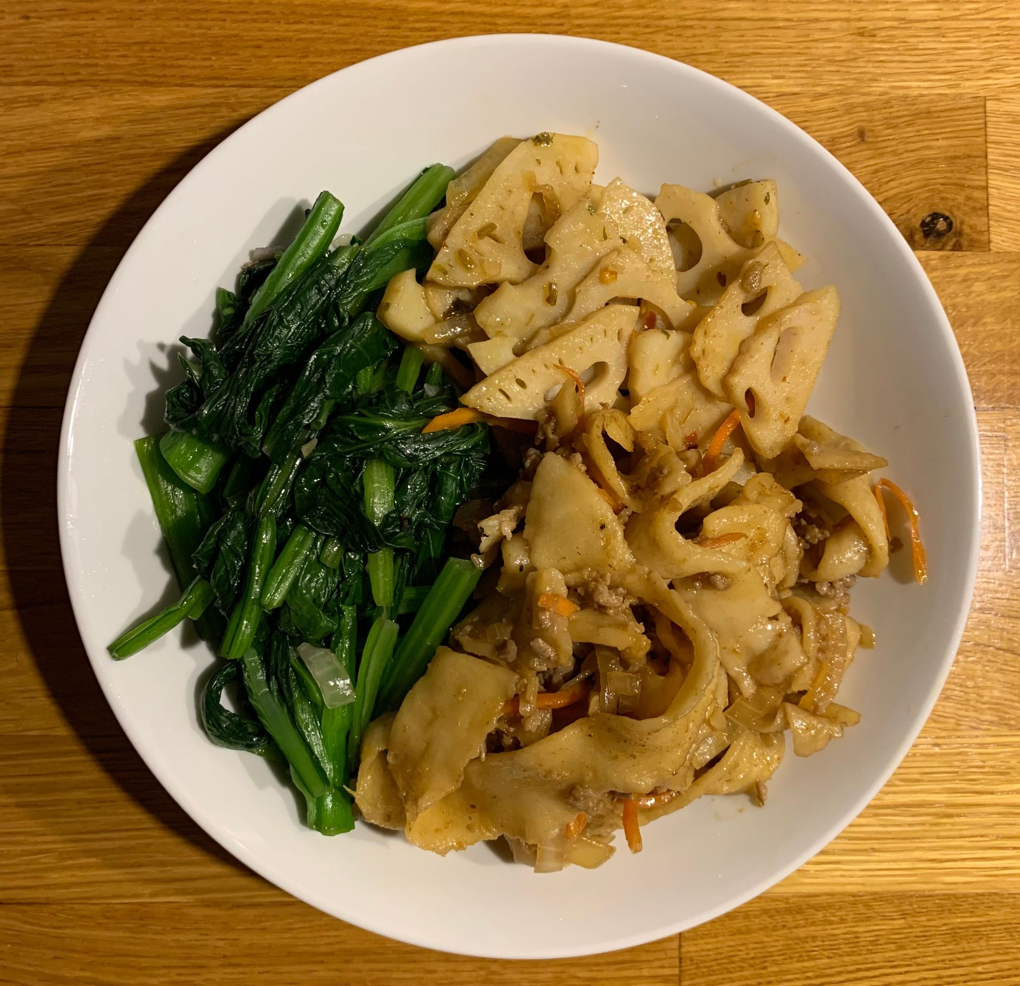 Hand pulled noodles with stir fried lotus root and some garlic flavored greens