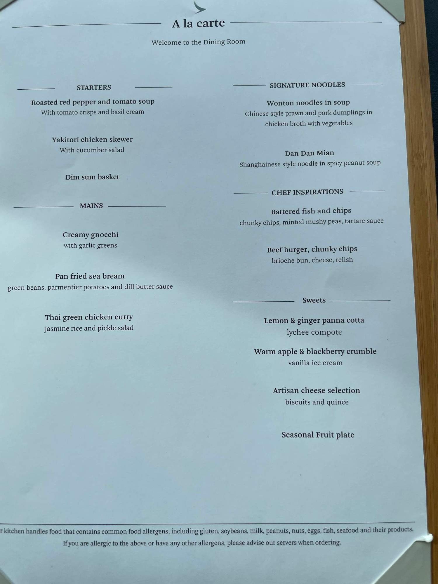 CX First Class Lounge lunch menu.