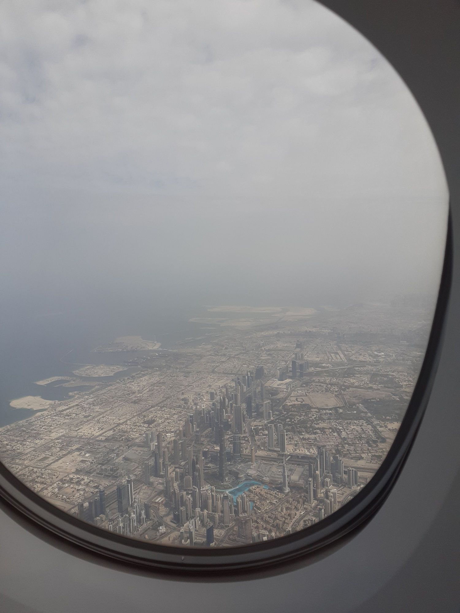 View of downtown Dubai after take off on BA104 DXB-LHR on 5th March ( upper deck A380 seat 51k) .Took off on 12R then did a 180 turn to start the flight back to London