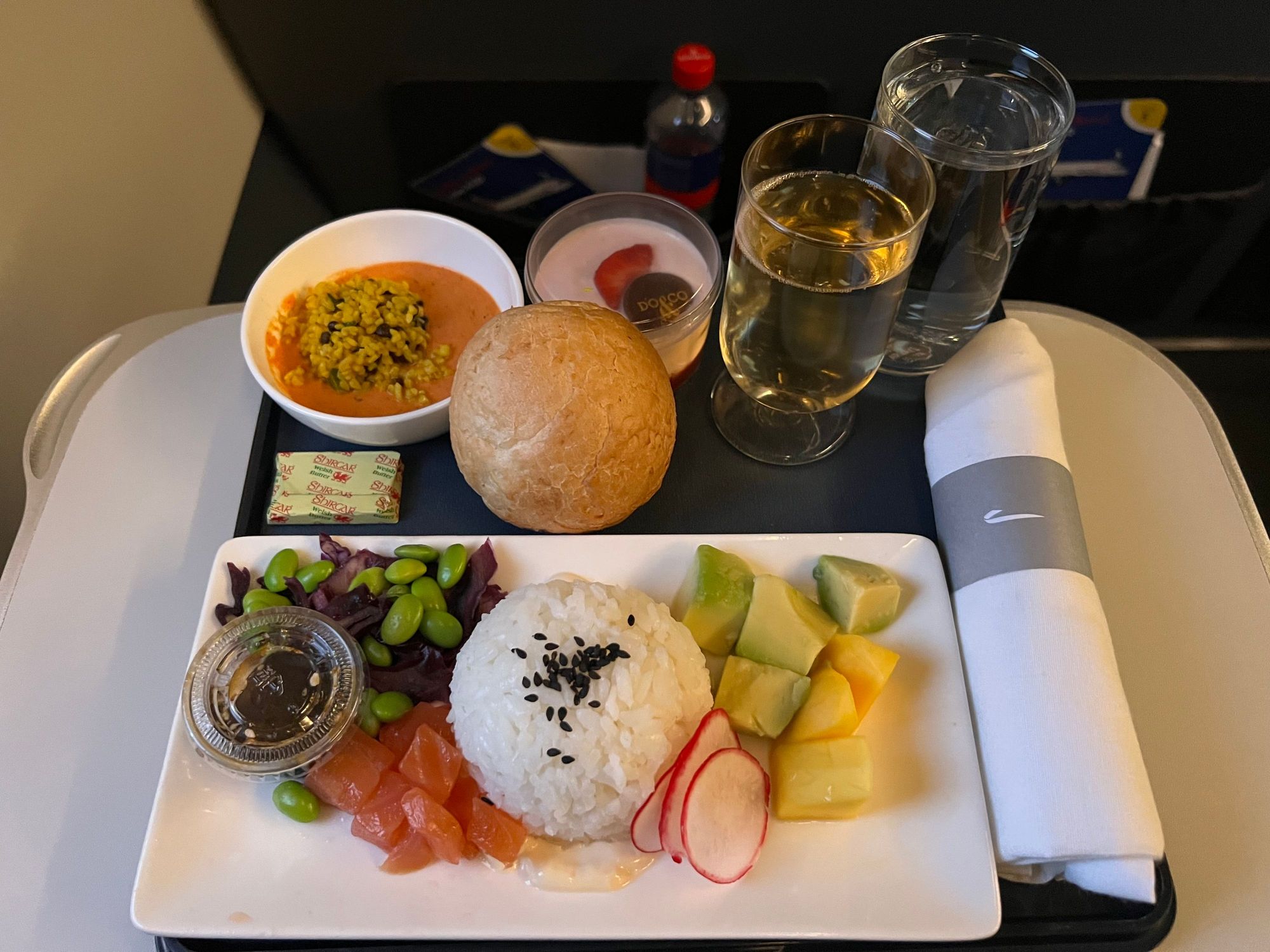I’ve finally had the poke bowl and must say I’m impressed. The starter (no idea what it was!) felt a bit out of place but was very good too! It really felt like a mini three course meal, and that on a short 45 minute sector 👍