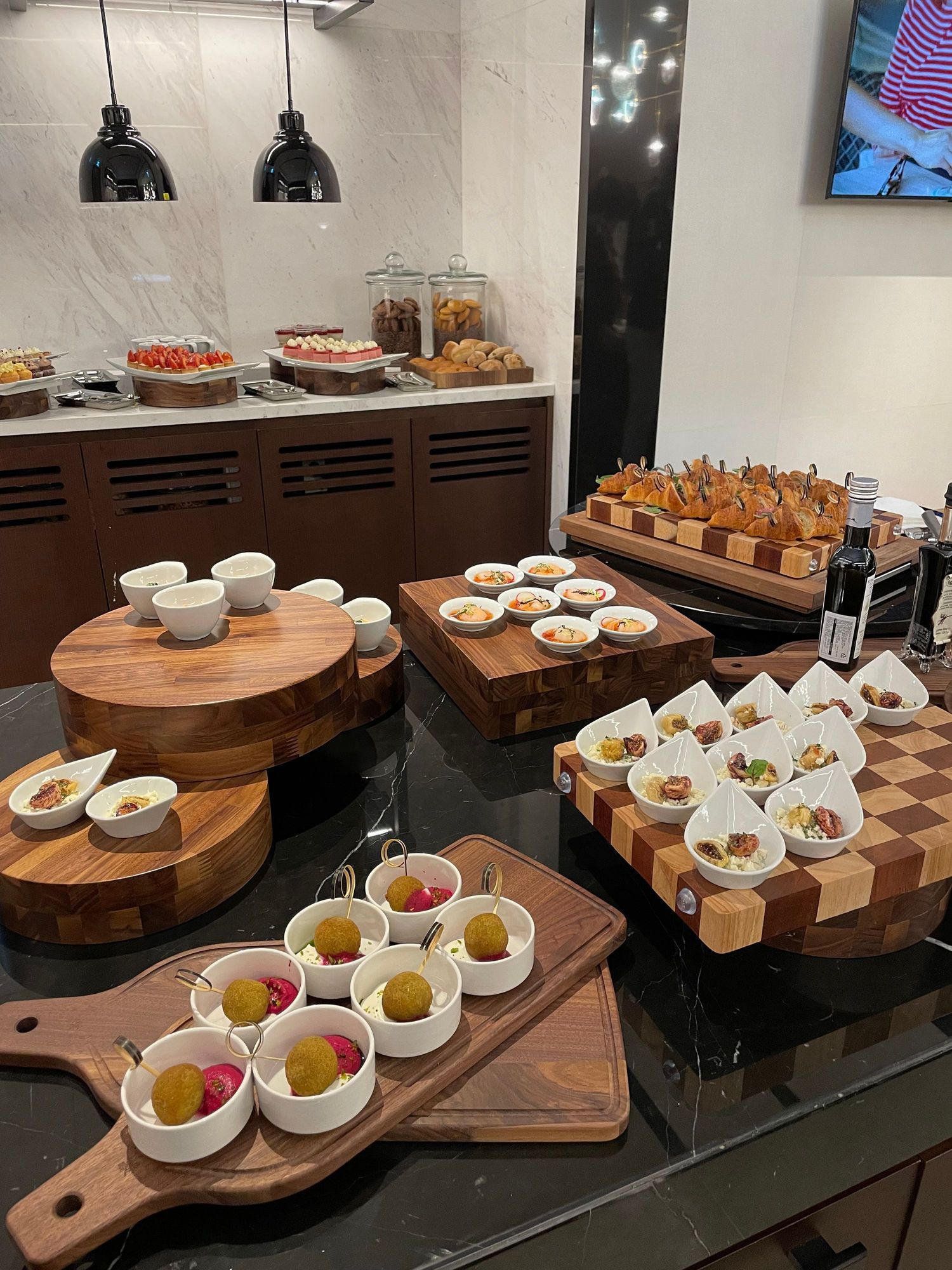Amuse bouche featured salmon tartare, shrimp, Greek cheese, and pastrami sandwiches.