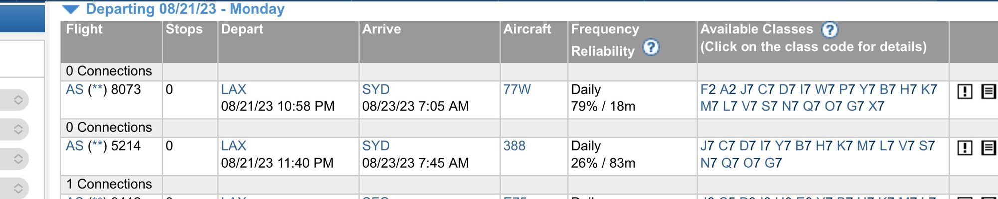 ExpertFlyer screenshot showing availability in F on AS-marketed flight LAX-SYD.