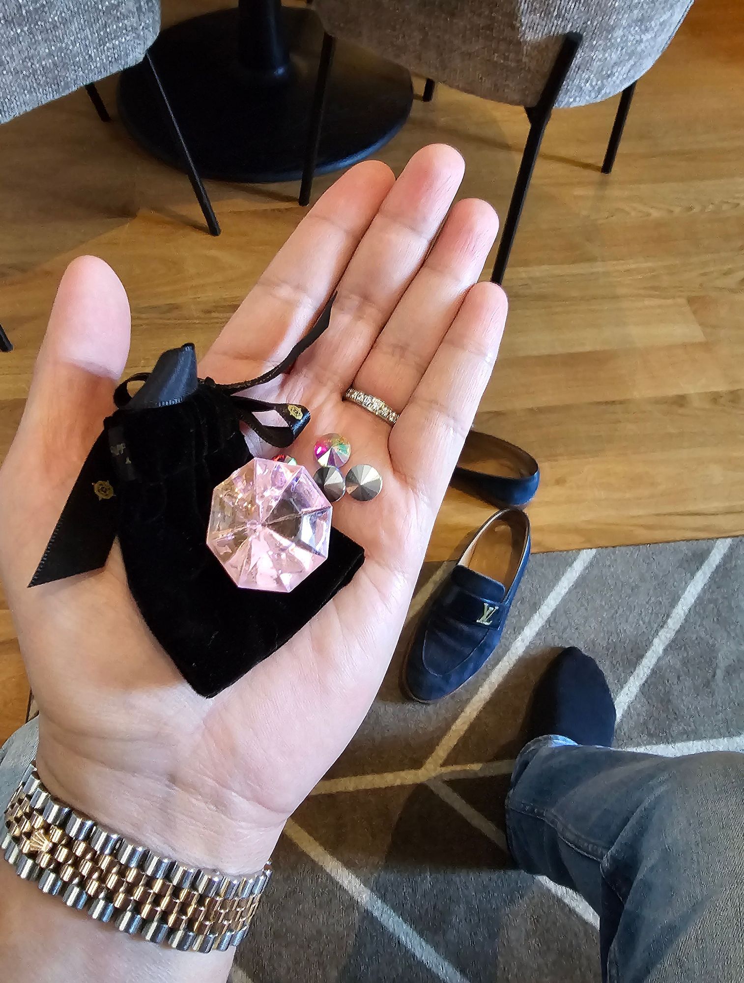 Large plastic diamond is for complimentary alcoholic beverages, and small sequences are for chocolates