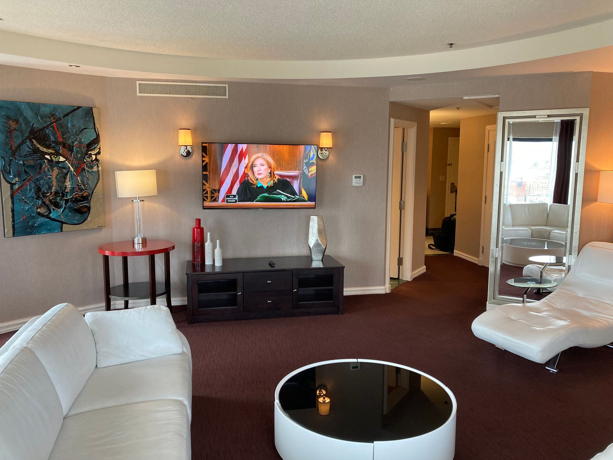 This is looking back at the end of the passage way, we are now in the living room, to the left Lisabel's art looks remarkable like Grace Jones and yes i'm just glued to the court room channel with judge Matthis