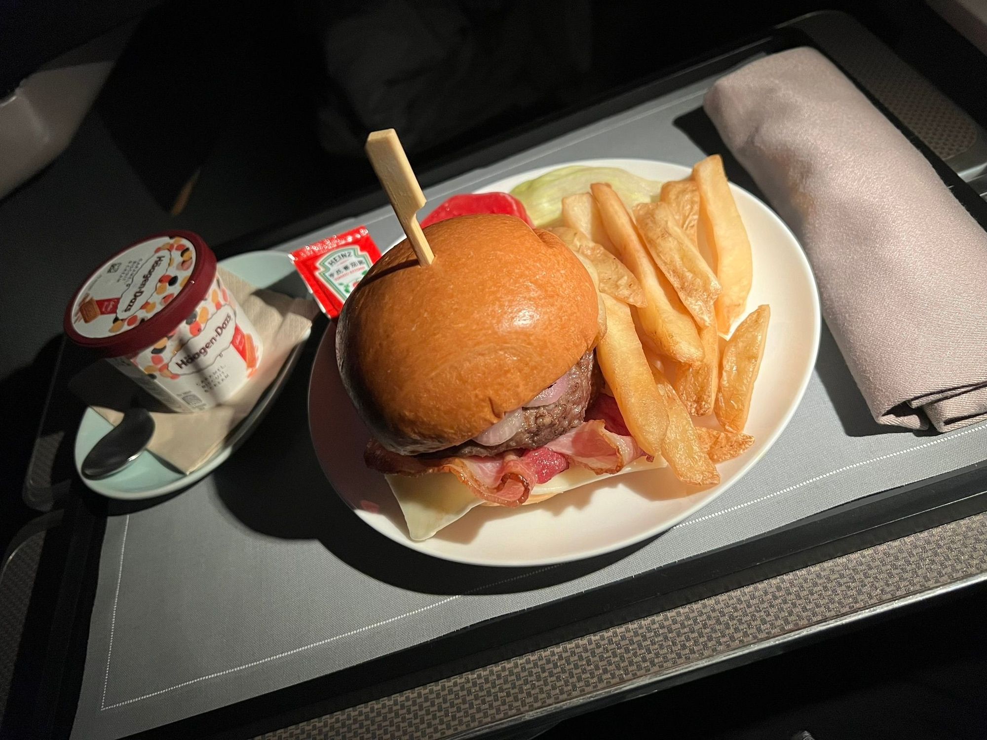 Classic beef burger and ice cream.