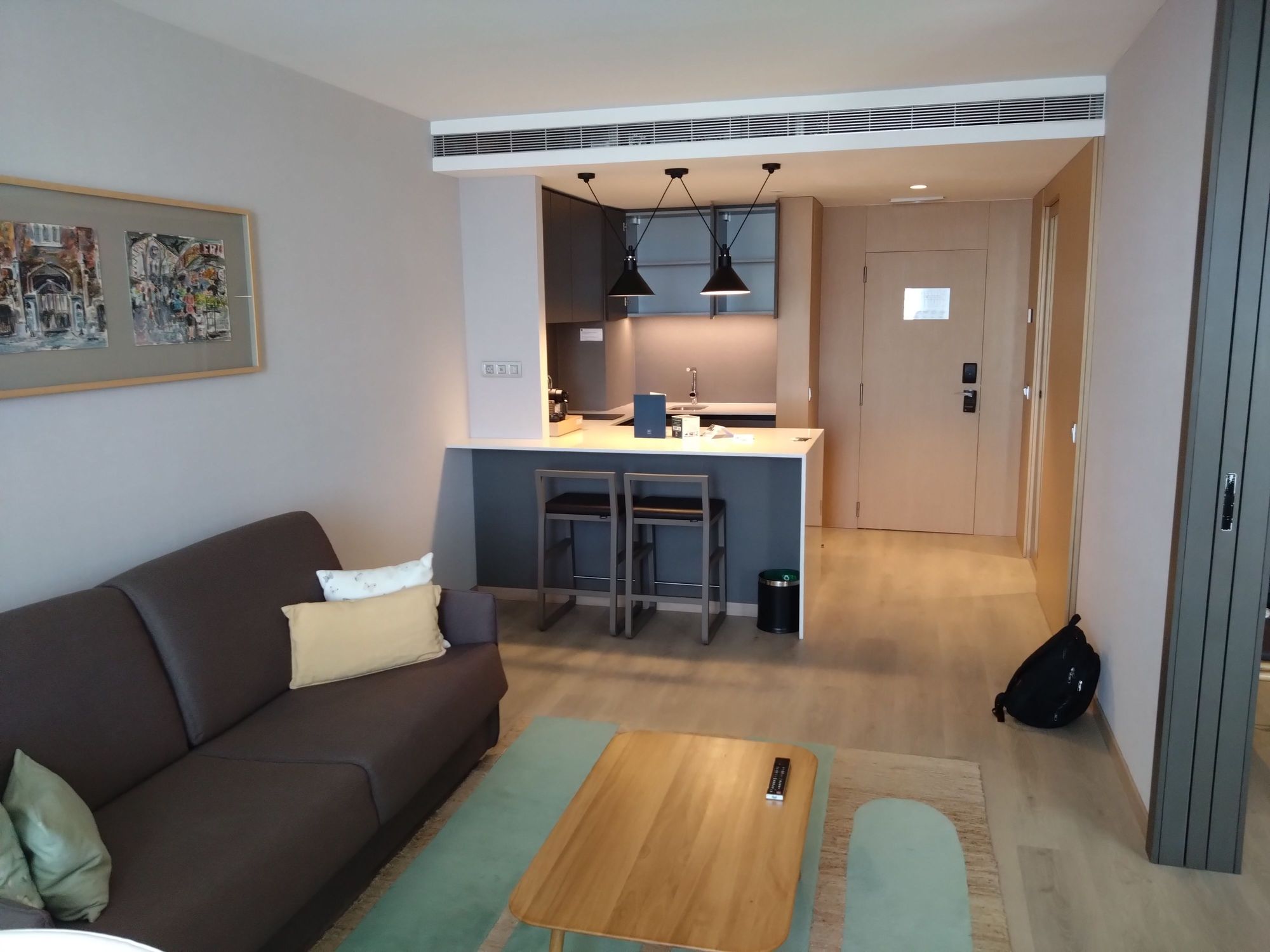 Living area, kitchen bar and kitchen