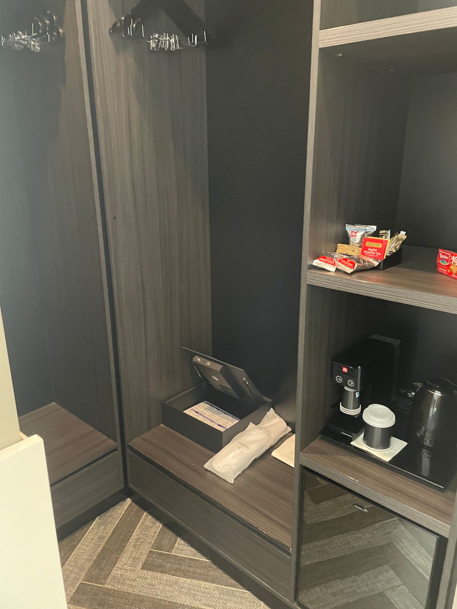 Walk in wardrobe and mini bar (behind bed)