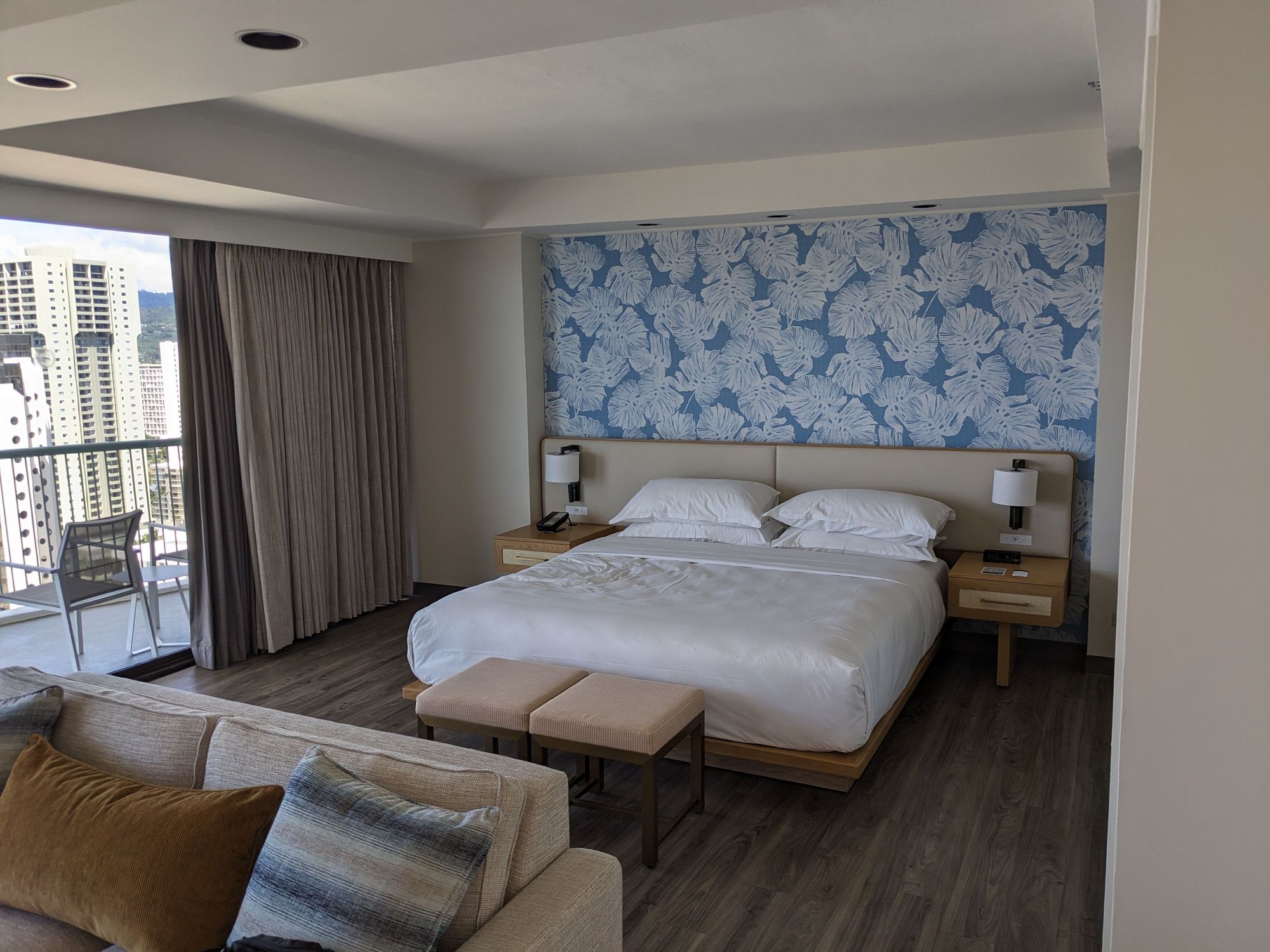 The bedroom portion of the Tower Corner Junior Suite, renovated. It has two sliding glass doors on one side, providing views of both the ocean and the mountains.