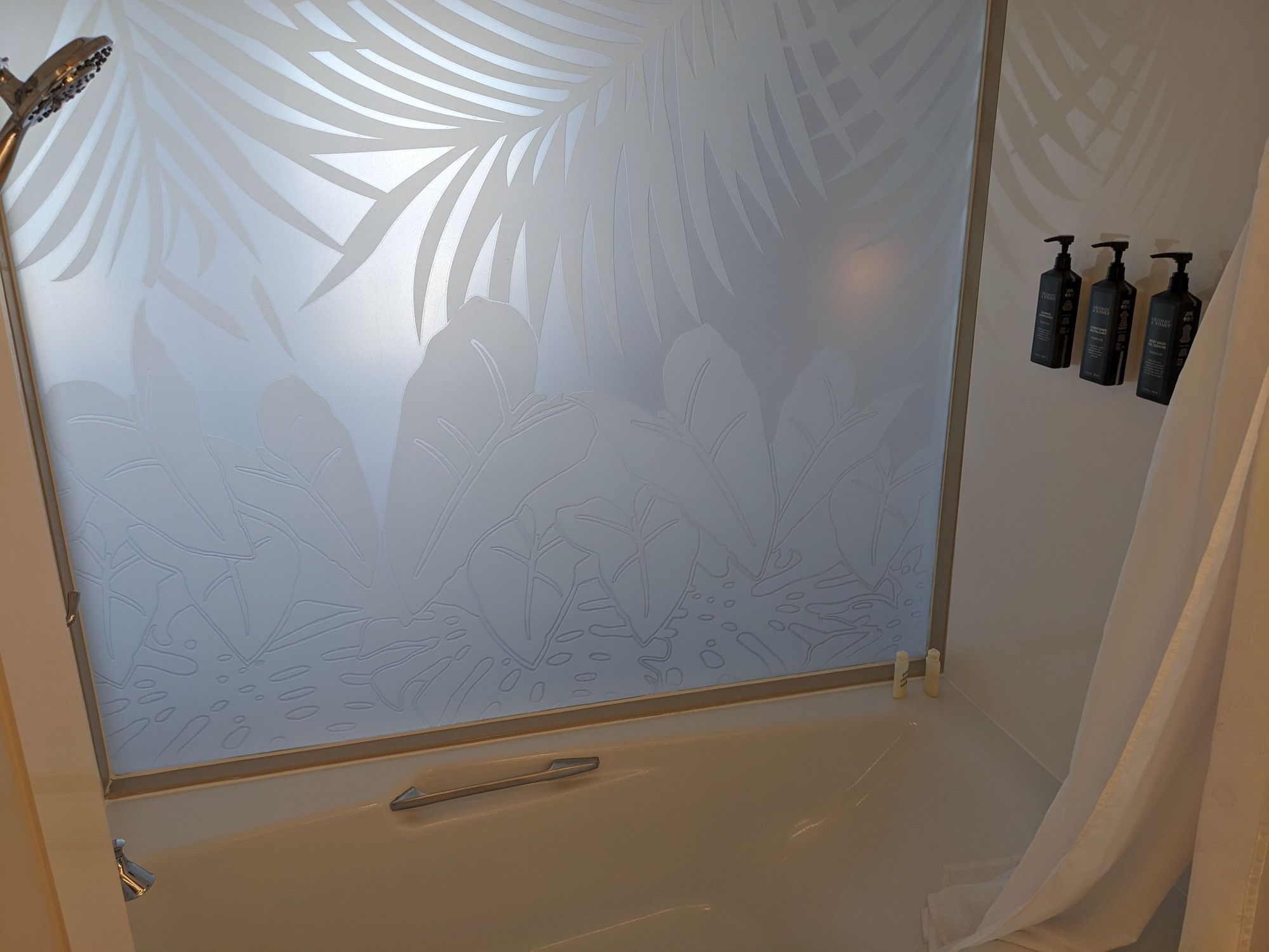 Very nice opaque glass between the bathroom and the bed area. However, when the lights in the bathroom are on, the bed area is illuminated too at night.