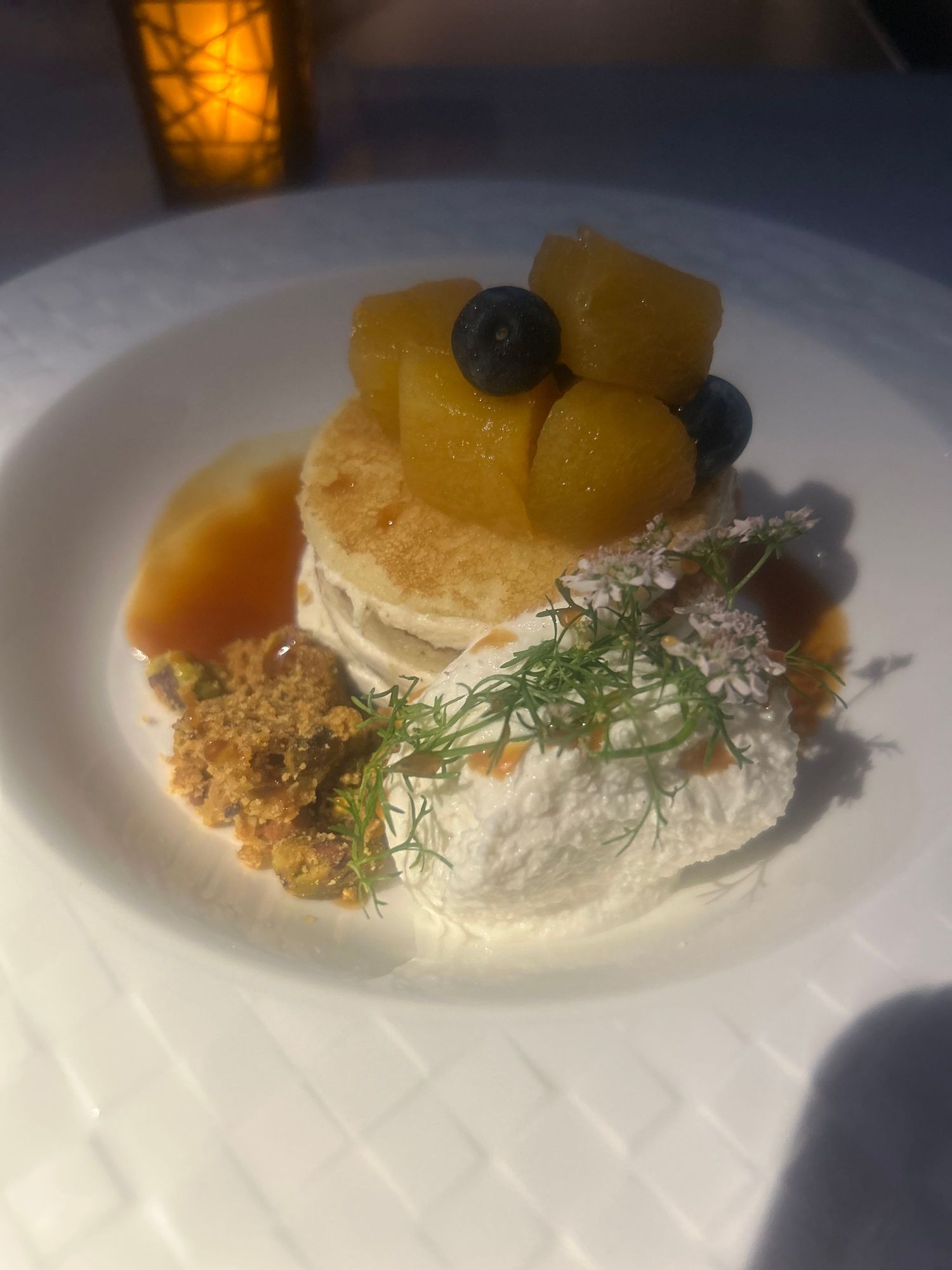 Potentially some of the best pancakes I’ve ever had - ricotta, pistachio crumble and fruit