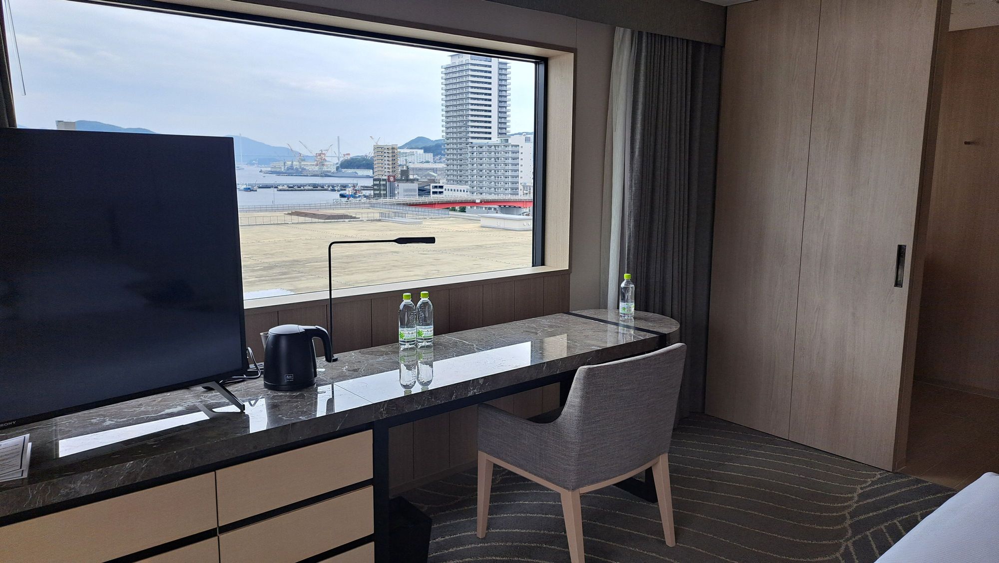 TV and desk with bathroom to right. Facing the bay and the conference centre roof. Fridge to the left