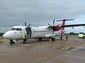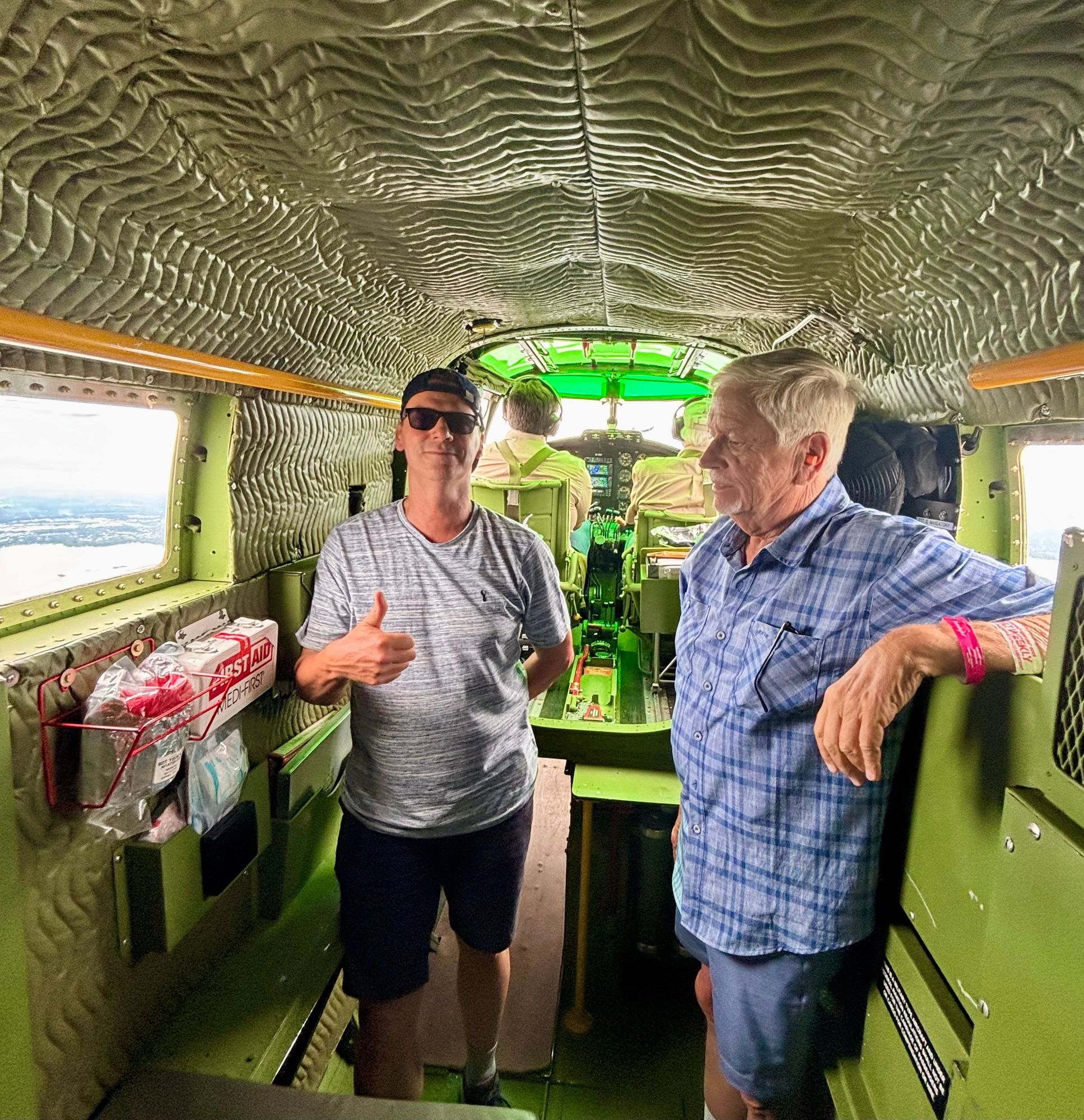 In the front section, behind the pilots and in front of the two forward passenger seats