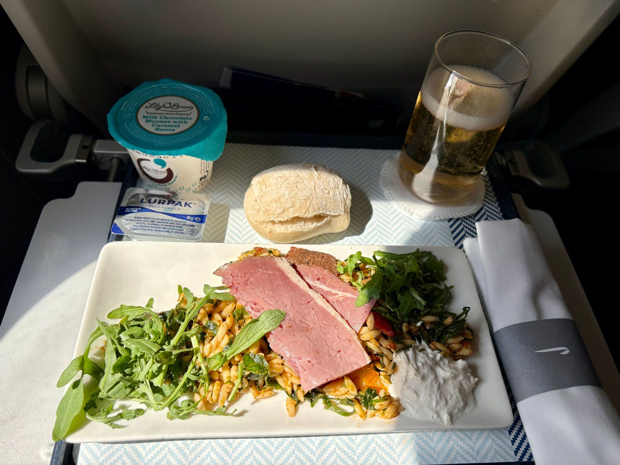 Beef with slow roasted tomato orzo salad, horseradish crème fraiche and rocket