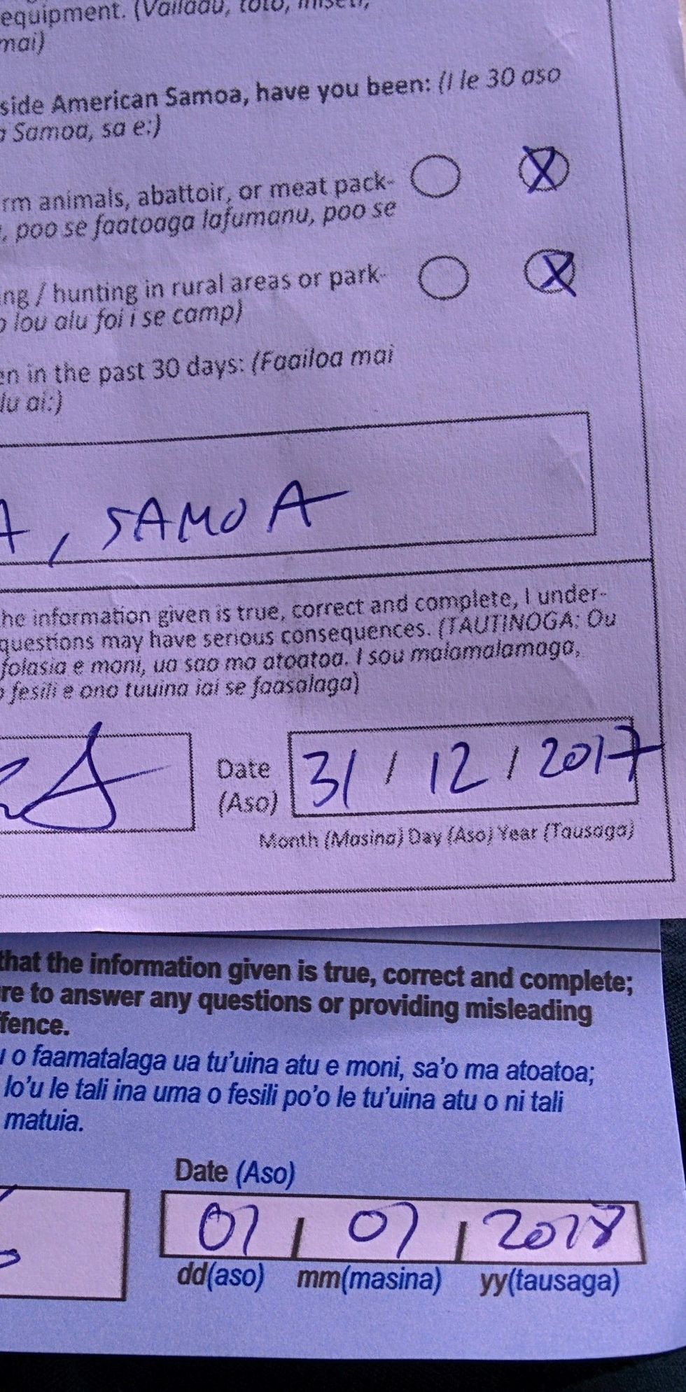 Departure card from Jan.1.2018, arrival card for American Samoa for Dec.31.2017