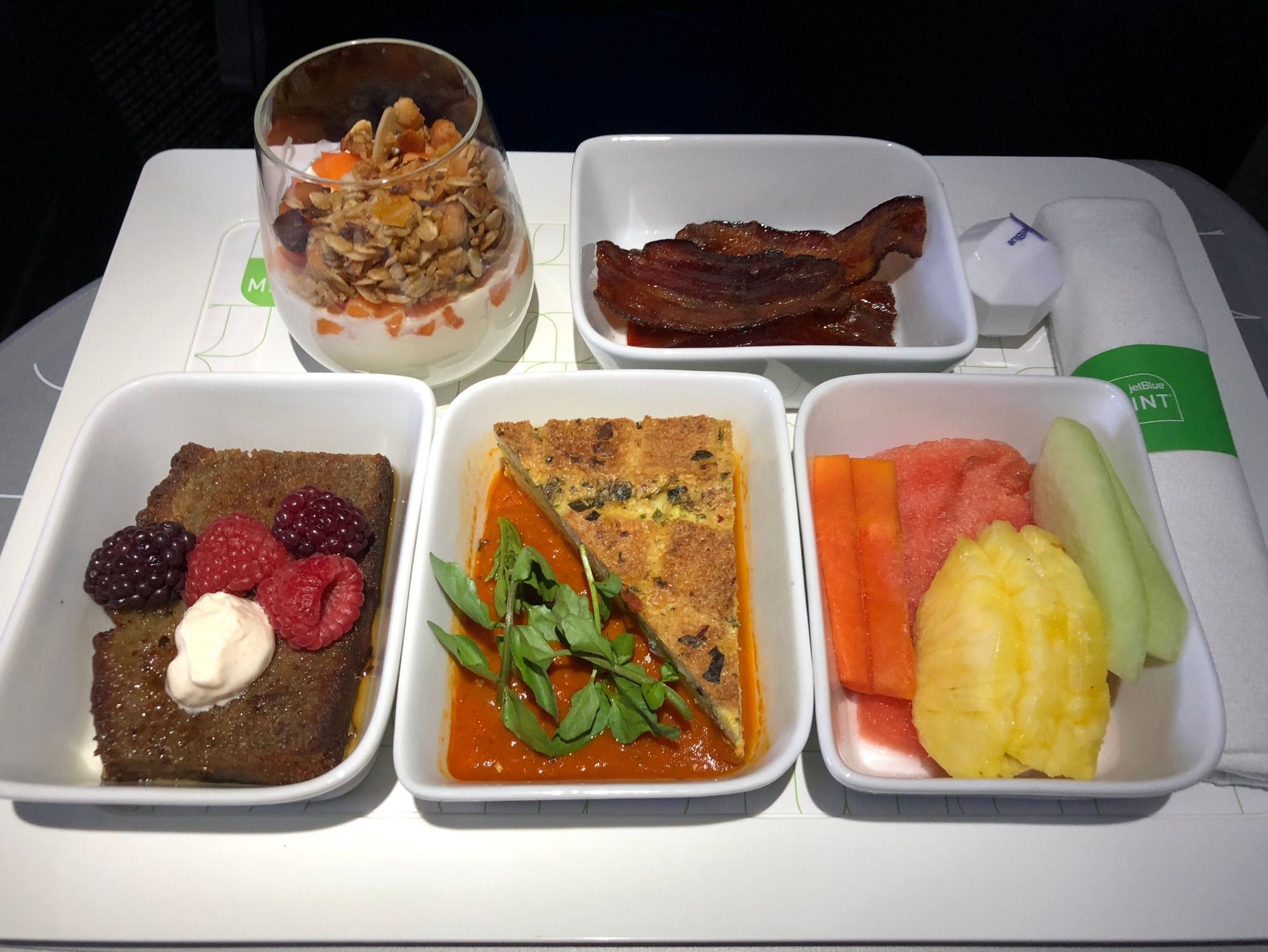 Clockwise from top left: yogurt parfait, maple glazed bacon, fresh fruit, sausage strata, spiced banana French toast